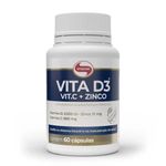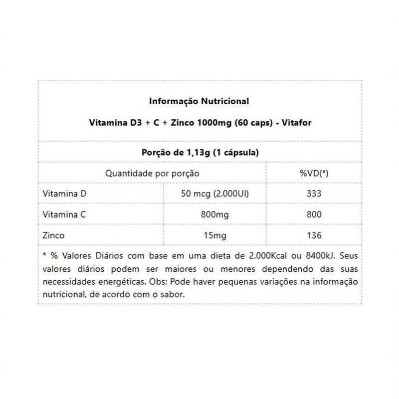 Vita D3 + Vit C + Zinco (60 Caps) - Padrão: únicoVita D3 Vitamina C + Zinco (60 caps) VITA D3 Vitamina C + Zinco é um suplemento alimentar à base das vitaminas D, vitamina C e Zinco. Essencial para o bom funcionamento do organismo, ajuda a completar as necessidades diárias de vitamina D, C e Zinco. Benefícios:- A vitamina C, D e o zinco auxiliam no funcionamento do sistema imune; - A vitamina D auxilia na formação de ossos e dentes e o zinco na manutenção de ossos; - A vitamina C e o zinco são antioxidantes que auxiliam na proteção dos danos causados pelos radicais livres; - O zinco auxilia na visão, no metabolismo da vitamina A, na síntese de proteínas e contribui para a manutenção do cabelo, da pele e das unhas.Informação Nutricional Vitamina D3 + C + Zinco 1000mg (60 caps) - VitaforPorção de 1,13g (1 cápsula)Quantidade por porção%VD(*)Vitamina D50 mcg (2.000UI)333Vitamina C800mg800Zinco15mg136* % Valores Diários com base em uma dieta de 2.000Kcal ou 8400kJ. Seus valores diários podem ser maiores ou menores dependendo das suas necessidades energéticas. Obs: Pode haver pequenas variações na informação nutricional, de acordo com o sabor.