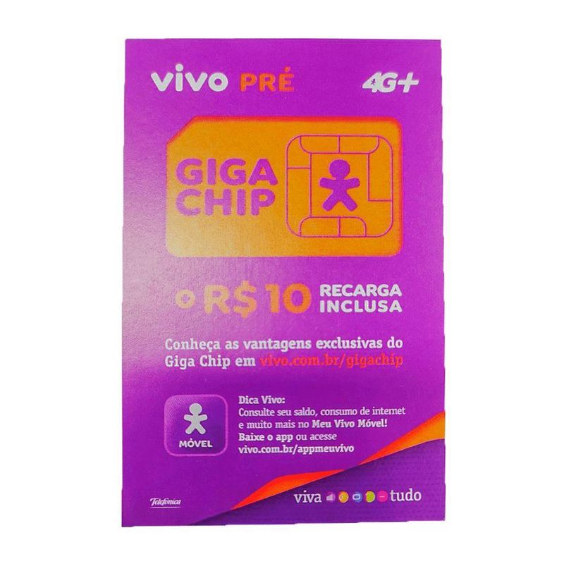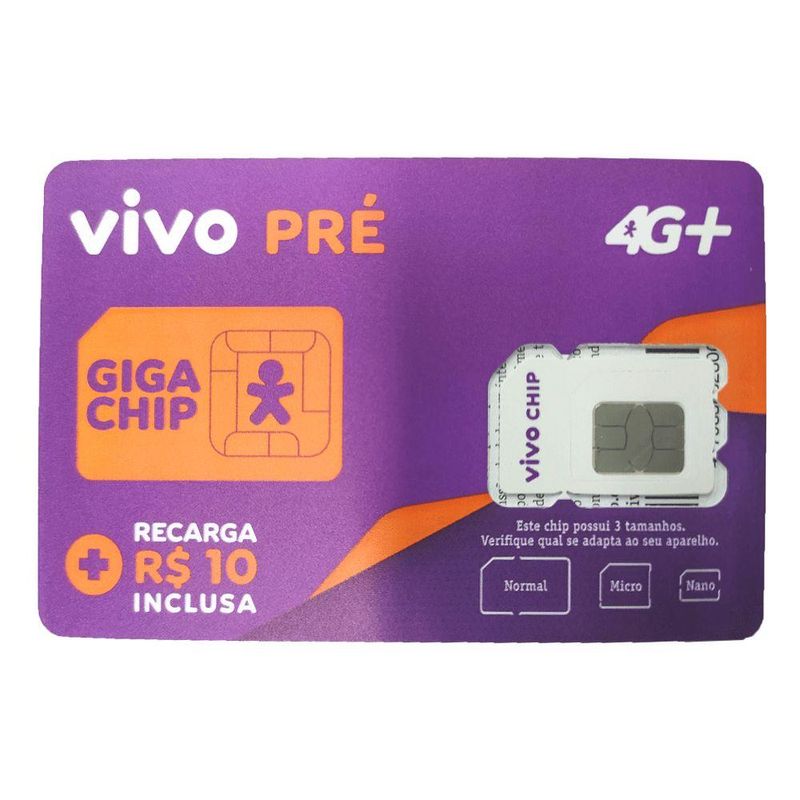 O Vivo Chip Triplo Corte 4G - Pré Pago é um dispositivo que junto com seu celular troca informações com a rede da operadora de telefonia por ondas de rádio. Este é um chip 4G que armazena o número de telefone do assinante, a sua senha pessoal (PIN) e dados pessoais como, por exemplo, agenda de telefone. É só encaixar seu chip, fazer uma recarga e ativar seus benefícios com a operadora. Consulte demais condições e vigência no site da Vivo. • Incluso R$10,00 de Recarga • Marca: VIVO • Operadora: Vivo • Plano: Pré-pago • Tecnologia: 4G • DDD: Todos • Região: Brasil • Cor: Roxo Itens Inclusos • 01 Cartão Chip Peso e Dimensões Aproximadas do produto na embalagem: • Largura: 6 cm. Altura: 9 cm. Profundidade: 2 cm. • Peso: 10 g.