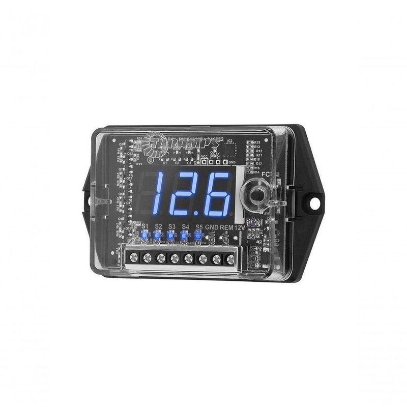 Voltimetro Digital Taramps Vts 5.1O VTS 5.1 vai muito além de monitorar a ?Voltagem? das baterias. Com 5 saídas sequenciais para acionamento do sistema de som, ele possui alertas e proteções contra tensão alta e baixa, registro de tensão mínima (HOLD) e modo SPL (permite funcionar em sistemas acima de 16V). Tudo isso e muito mais, com o menor consumo e custo benefício do mercado. *Imagens meramente ilustrativas. DIMENSÕES (LXAXP): 88 x 19,5 x 53mm PESO: 0,1 Kg Range de Medição: 6V ~ 30V DC Consumo em Stand-By: 0,1mA Consumo Nominal (Ligado): 100mA Número de saídas do sequenciador: 5 Capacidade da saída do sequenciador: 150mA Proteção de bateria baixa: 9V (Saídas de S1 à S5 são desligadas) Indicação de bateria baixa: Quando a bateria está abaixo de 10,2V o display pisca Proteção de bateria alta: Desliga as saídas S1 a S5 quando a voltagem excede 16,5V (padrão) ou 19,5V (Modo SPL)O VTS 5.1 vai muito além de monitorar a ?Voltagem? das baterias. Com 5 saídas sequenciais para acionamento do sistema de som, ele possui alertas e proteções contra tensão alta e baixa, registro de tensão mínima (HOLD) e modo SPL (permite funcionar em sistemas acima de 16V). Tudo isso e muito mais, com o menor consumo e custo benefício do mercado. *Imagens meramente ilustrativas. DIMENSÕES (LXAXP): 88 x 19,5 x 53mm PESO: 0,1 Kg Range de Medição: 6V ~ 30V DC Consumo em Stand-By: 0,1mA Consumo Nominal (Ligado): 100mA Número de saídas do sequenciador: 5 Capacidade da saída do sequenciador: 150mA Proteção de bateria baixa: 9V (Saídas de S1 à S5 são desligadas) Indicação de bateria baixa: Quando a bateria está abaixo de 10,2V o display pisca Proteção de bateria alta: Desliga as saídas S1 a S5 quando a voltagem excede 16,5V (padrão) ou 19,5V (Modo SPL)