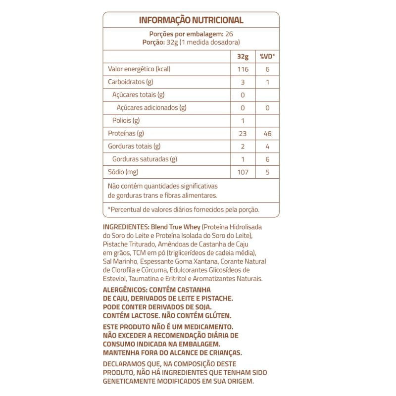 O Whey Protein da True Source é elaborado com um blend de proteína isolada e hidrolisada do soro do leite, é livre de glúten, açúcar e corantes artificiais. Pode ser usado como pré ou pós-treino, e possui sabor irresistível de ice cream pistachio. Sobre os ingredientes: Proteína isolado do soro do leite: passa por um processo minucioso de filtragem, eliminando a lactose e a caseína. Proteína hidrolisado do soro do leite: além de ter um processo minucioso de filtragem, essa proteína passa por um processo chamado hidrólise, onde as moléculas de proteínas são quebradas em segmentos ainda menores, chamados peptídeos, o que torna a digestão e absorção mais fácil pelo organismo. Sugestão de consumo: Recomenda-se diluir uma medida (32g) em aproximadamente 150ml de água. Pode ser usado como pré ou pós-treino, ou conforme prescrição do nutricionista. Motivos para escolher o produto: Possui 23g de proteína; Sem glúten e corantes artificiais; Elaborado com proteína isolada e hidrolisada; Adoçado com Stévia, Taumatina e Maltitol; 2,5g de colágeno Verisol®; A Marca A True Source é uma empresa movida pelo bem-estar, rendimento físico e pela natureza. Os produtos da True Source são elaborados com matéria-prima importada, ingredientes extraídos da natureza, proteínas limpas e sem aditivos, com isso a marca traz uma suplementação perfeita para sua dieta, com produtos de qualidade e sabor excelente.
