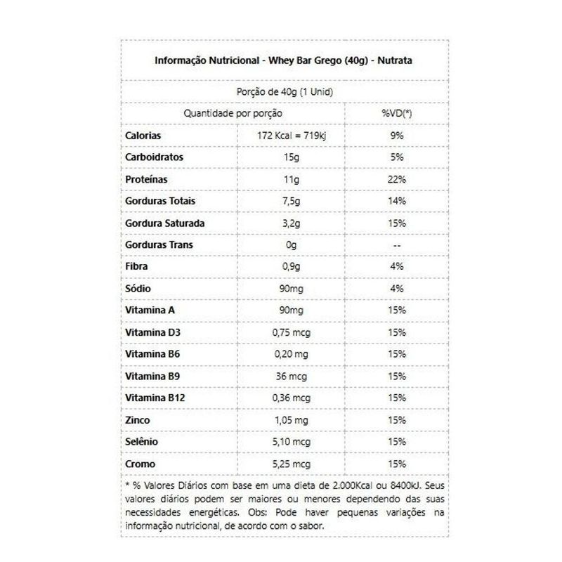 Whey Grego Bar (40g) - Sabor: Torta De LimãoWhey Grego Bar (40g) - Nutrata Grego Bar é prática, balanceada e pode ser usada como lanche intermediário para controlar a ingestão excessiva, em dietas de controle de peso ou definição. Também, é importante incremento proteico para minimizar a perda de massa muscular como consequência dos treinos ou durante dietas de restrição calórica. Novo Whey Grego Bar Sabor Dulce de Leche Havanna: A barra de proteína feita com o legítimo Dulce de Leche Havanna. Whey Grego Bar Dulce de Leche Havanna, une a credibilidade da Nutrata no desenvolvimento de barras de proteína com a tradição e elegância do tradicional dulce de leche Havanna, em uma apresentação surpreendente, recheada de sabor e nutrição. Benefícios: - Com Whey Isolado e Whey Concentrado;- 11g de proteína em 40g de barra;- Aporte de fibra prebiótica de alta tecnologia (OraftiSynergy1);- Adicionado de vitamina D3 e picolinato de cromo;- Possui mix especial de vitaminas e minerais;- Adoçado com poliol;- Excelente fonte de BCAA;- Zero Glúten.Informação Nutricional Whey Bar Grego (40g) - Nutrata Porção de 40g (1 Unid)Quantidade por porção%VD(*)Calorias 172 Kcal = 719kj9%Carboidratos15g5%Proteínas11g22%Gorduras Totais7,5g14%Gordura Saturada3,2g15%Gorduras Trans0g--Fibra0,9g4%Sódio90mg4%Vitamina A90mg15%Vitamina D30,75 mcg15%Vitamina B60,20 mg15%Vitamina B936 mcg15%Vitamina B120,36 mcg15%Zinco1,05 mg15%Selênio5,10 mcg15%Cromo5,25 mcg15%* % Valores Diários com base em uma dieta de 2.000Kcal ou 8400kJ. Seus valores diários podem ser maiores ou menores dependendo das suas necessidades energéticas. Obs: Pode haver pequenas variações na informação nutricional, de acordo com o sabor.