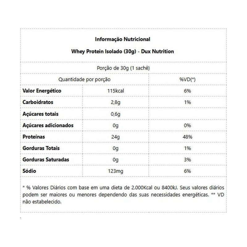 Whey Protein Isolado Sachê - Sabor: Doce De Leite (30g)Whey Protein Isolado Sachê O Whey Protein Isolado Dux Nutrition possui baixo teor de gorduras e carboidratos, sendo ideal para construção e recuperação muscular sem perda de definição, como um snack fit prático ou sem culpa em suas receitas. Uma proteína 100% pura, duplamente filtrada, sem adição de outro tipo de Whey ou de proteínas inferiores. Se há um nutriente indispensável, é a proteína. Ela é feita de aminoácidos, que são os blocos de construção do nosso corpo. A proteína do soro do leite, em inglês “Whey Protein”, é uma das fontes de aminoácidos de melhor absorção, maior até que o frango ou peixe. Isso torna o Whey uma forma conveniente de ingerir proteína, melhorando a saúde, o bem-estar e os resultados dos treinos. BENEFÍCIOS: * Matéria-prima premium importada, obtida através do processo de extração de microfiltragem, sem renunciar do sabor real das nossas proteínas;* Aporte completo de aminoácidos: 6,2g de BCAAs; 4,7g de glutamina e 2,9g de leucina, por dose;* 24g de proteína;* Disponível em versões sem adoçantes artificiais, 100% naturais;* O nome diz tudo: Whey Protein Isolado 100% puro, com transparência total, do nome do produto à lista de ingredientes;* Não contém goma xantana, complexos vitamínicos à base de maltodextrina, espessantes, estabilizantes, conservantes ou qualquer outro ingrediente inferior;* Proteína moderna, desenvolvida por especialistas para atletas de esportes de performance (bodybuilding, crossfit e artes marciais), pessoas que buscam uma proteína com baixa caloria (para snacks fit e receitas sem culpa) e pessoas que buscam uma proteína ultrapura de altíssima qualidade;* Contém corantes 100% naturais, sem ingredientes artificiais. Informação Nutricional Whey Protein Isolado (30g) - Dux Nutrition - Sabor CookiesPorção de 30g (1 sachê)Quantidade por porção%VD(*)Valor Energético115kcal6%Carboidratos2,8g1%Açúcares totais0,6g Açúcares adicionados0g0%Proteínas24g48%Gorduras Totais0g1%Gorduras Saturadas0g3%Sódio123mg6%* % Valores Diários com base em uma dieta de 2.000Kcal ou 8400kJ. Seus valores diários podem ser maiores ou menores dependendo das suas necessidades energéticas. ** VD não estabelecido. Informação Nutricional Whey Protein Isolado (28g) - Dux Nutrition - Sabor NeutroPorção de 28g (1 sachê)Quantidade por porção%VD(*)Valor Energético105kcal6%Carboidratos2,8g1%Açúcares totais0,6g Proteínas24g48%Gorduras Totais0,6g1%Gorduras Saturadas0,3g3%Sódio118mg6%Não contém quantidades significativas de açúcares adicionados, gorduras trans e fibras alimentares. * Percentual de valores diários fornecidos pela porção. Informação Nutricional Whey Protein Isolado (28g) - Dux Nutrition - Sabor CocoPorção de 28g (1 sachê)Quantidade por porção%VD(*)Valor Energético107kcal6%Carboidratos1,5g1%Açúcares totais0,6g Proteínas24g48%Gorduras Totais0,6g1%Gorduras Saturadas0,3g3%Sódio118mg6%Não contém quantidades significativas de gorduras trans e fibras alimentares. * Percentual de valores diários fornecidos pela porção. Informação Nutricional Whey Protein Isolado (30g) - Dux Nutrition - Sabor Doce de LeitePorção de 30g (1 sachê)Quantidade por porção%VD(*)Valor Energético108kcal6%Carboidratos1,6g1%Açúcares totais0,7g Açúcares adicionados0g Proteínas24g48%Gorduras Totais0,6g1%Gorduras Saturadas0,4g3%Sódio125mg6%Não contém quantidades significativas de gorduras trans e fibras alimentares. * Percentual de valores diários fornecidos pela porção. Informação Nutricional Whey Protein Isolado (30g) - Dux Nutrition - Sabor CappuccinoPorção de 30g (1 sachê)Quantidade por porção%VD(*)Valor Energético112kcal6%Carboidratos2,2g1%Açúcares totais0,6g Açúcares adicionados0g0%Proteínas24g48%Gorduras Totais0,81%Gorduras Saturadas0,3g2%Fibras alimentares0,6g2%Sódio118mg6%Cafeína80mg Não contém quantidades significativas de gorduras trans e fibras alimentares. * Percentual de valores diários fornecidos pela porção.