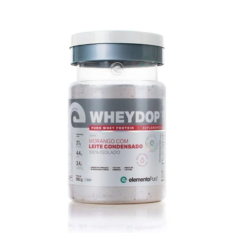 Wheydop Iso (900g) - Sabor: Morango C/ Leite CondensadoWheyDop ISO (900g) – Elemento Puro Desenvolvido no Brasil com matéria-prima europeia, WHEYDOP ISO é o suplemento proteico ideal para atletas intolerantes à lactose ou em dietas restritas em carboidratos e gorduras. Em uma combinação de aromas incríveis com a mais pura proteína do soro do leite (WPI), criamos um whey protein 100% isolado — 0 g de lactose — e que surpreende no sabor. WHEYDOP ISO fornece 22 g de proteína, 4,6 g de BCAAs e 3,6g de glutamina e percursores em apenas 26 g de produto. - SABOR INDESCRITÍVEL. WHEYDOP ISO é feito com matéria-prima de origem europeia, mercado conhecido pelo alto grau de exigência e que se difere dos demais por extrair o whey protein sem usar reagentes químicos, o que garante a qualidade superior de WHEYDOP ISO e resulta em sabores incomparáveis, livre daquele desagradável gostinho residual de whey protein, além de conter mais cálcio e menos sódio. Benefícios: * Sabor único;* Rápida absorção;* Baixo carboidrato;* Possui alta concentração de proteína;* Facilita o ganho de massa muscular.Informação Nutricional WheyDop ISO (900g) – Elemento PuroSabor: Baunilha CaramelizadaPorção de 26g (1 scoop)Quantidade por porção%VD(*)Valor energético92Kcal5%Carboidratos2,9g1%Açúcares totais1,8g**Proteínas20g40%Sódio96mg5%Cálcio101mg10%* % Valores Diários com base em uma dieta de 2.000Kcal ou 8400kJ. Seus valores diários podem ser maiores ou menores dependendo das suas necessidades energéticas.** Valor Diário não estabelecido. Informação Nutricional WheyDop ISO (900g) – Elemento PuroSabor: Banana com CanelaPorção de 26g (1 scoop)Quantidade por porção%VD(*)Valor energético95,9Kcal - 401,2kJ4%Carboidratos0,6g0%Lactose0**Proteínas22g29%Gorduras Totais0,3g0%Gorduras Saturadas0g0%Gorduras Trans0g**Fibra Alimentar0g0%Sódio39,2mg1%Cálcio102,2mg10%Magnésio18,9mg7%Fósforo68,4mg9%Potássio146,6mg3%* % Valores Diários com base em uma dieta de 2.000Kcal ou 8400kJ. Seus valores diários podem ser maiores ou menores dependendo das suas necessidades energéticas. Obs: Pode haver pequenas variações na informação nutricional, de acordo com o sabor. Informação Nutricional WheyDop ISO (900g) – Elemento PuroSabor: Chocolate BelgaPorção de 26g (1 scoop)Quantidade por porção%VD(*)Valor energético118,8Kcal = 497,1kJ5%Carboidratos0,45g0%Lactose0g**Proteínas22g28%Gorduras Totais0,5g0%Gorduras Saturadas0g0%Gorduras Trans0g**Fibra Alimentar0,5g2%Sódio67,6mg2%Cálcio99,8mg9%Magnésio25,7mg9%Fósforo77,2mg11%Potássio221mg4%* % Valores Diários com base em uma dieta de 2.000Kcal ou 8400kJ. Seus valores diários podem ser maiores ou menores dependendo das suas necessidades energéticas.** Valor Diário não estabelecido. Informação Nutricional WheyDop ISO (900g) – Elemento PuroSabor: Morango Leite CondensadoPorção de 26g (1 scoop)Quantidade por porção%VD(*)Valor energético94Kcal - 394kJ5%Carboidratos2g0%Lactose0**Proteínas21g28%Gorduras Totais0,1g0%Gorduras Saturadas0g0%Gorduras Trans0g**Fibra Alimentar0,2g2%Sódio58mg2%Cálcio106,05mg11%* % Valores Diários com base em uma dieta de 2.000Kcal ou 8400kJ. Seus valores diários podem ser maiores ou menores dependendo das suas necessidades energéticas. Obs: Pode haver pequenas variações na informação nutricional, de acordo com o sabor. Informação Nutricional WheyDop ISO (900g) – Elemento PuroSabor: Café MochaPorção de 26g (1 scoop)Quantidade por porção%VD(*)Valor energético97,5Kcal = 408kJ4%Carboidratos0,7g0%Lactose0g**Proteínas22g28%Gorduras Totais0,4g0%Gorduras Saturadas0g0%Gorduras Trans0g**Fibra Alimentar0g0%Sódio42,12mg1%Cálcio99,84mg9%Magnésio19,5mg7%Fósforo68,12mg9%Potássio153,92mg3%* % Valores Diários com base em uma dieta de 2.000Kcal ou 8400kJ. Seus valores diários podem ser maiores ou menores dependendo das suas necessidades energéticas.** Valor Diário não estabelecido. Informação Nutricional WheyDop ISO (900g) – Elemento PuroSabor: Arroz DocePorção de 26g (1 scoop)Quantidade por porção%VD(*)Valor energético92,4Kcal = 386,7kJ4%Carboidratos0,4g0%Lactose0g**Proteínas22g29%Gorduras Totais0,3g0%Gorduras Saturadas0g0%Gorduras Trans0g**Fibra Alimentar0g0%Sódio67,6mg2%Cálcio99,8mg9%Magnésio25,7mg9%Fósforo77,2mg11%Potássio221mg4%* % Valores Diários com base em uma dieta de 2.000Kcal ou 8400kJ. Seus valores diários podem ser maiores ou menores dependendo das suas necessidades energéticas.** Valor Diário não estabelecido. AMINOGRAMAPerfil Típico de Aminoácidos (Por 100g de proteína)EssenciaisIsoleucina (BCAA)6,3gLeucina (BCAA)9,7gValina (BCAA)5,1gLisina9,2gMetionina2,1gFenilalanina2,8gTreonina6,5gTriptofano1,9gCondicionalmente EssenciaisGlutamina e Precursores16,3gArginina2,0gCisteína2,3gTirosina2,7gHistidina1,5gProlina5,7gNão EssenciaisÁcido Aspártico10gAlanina4,8gGlicina1,5gSerina4,3gTotal de BCAAs: 21,1g