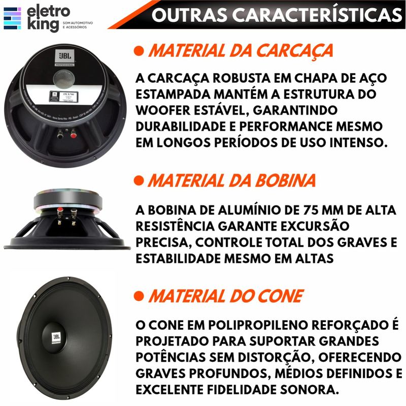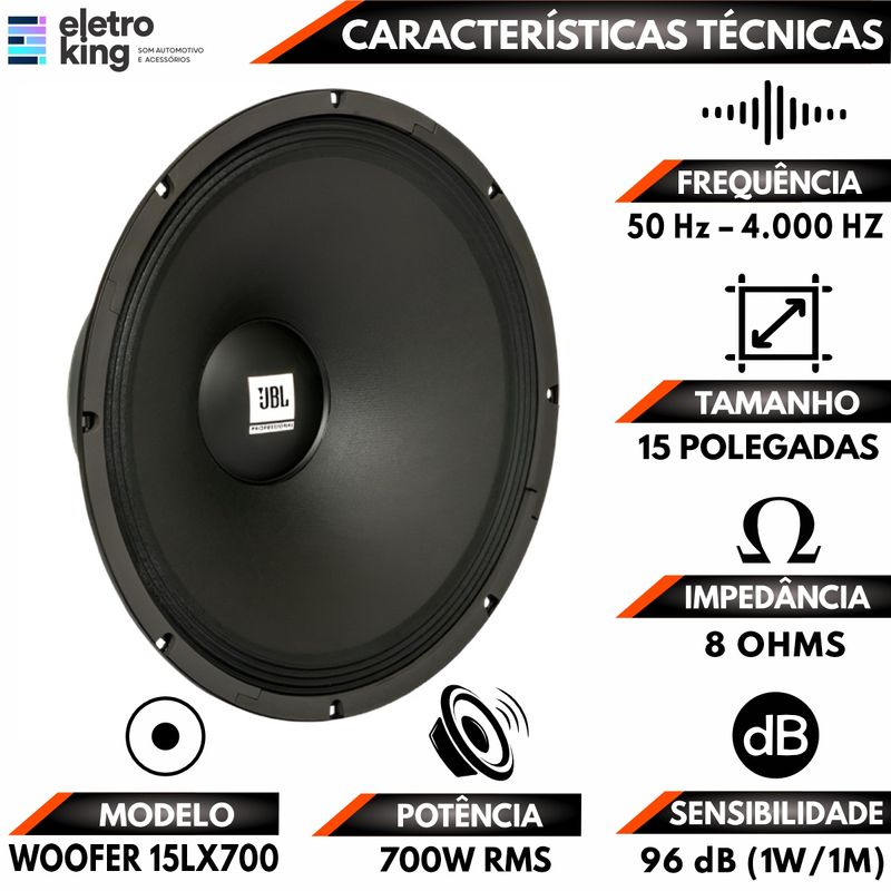 Woofer 15" JBL 15LX700 700 Watts RMS - 8 Ohms O Woofer JBL 15LX700 foi desenvolvido para quem busca potência, qualidade e durabilidade em sistemas de som automotivo. Com 700W RMS de potência, resposta de frequência ampla e excelente sensibilidade, ele garante graves profundos e médios definidos, proporcionando um som encorpado e de alto impacto. Seu conjunto magnético robusto, bobina de 75 mm e engenharia JBL asseguram performance profissional tanto para uso em projetos de trio elétrico quanto para sistemas internos, sempre mantendo a fidelidade sonora e a confiabilidade que só a JBL oferece. Especificações Técnicas: • Marca: JBL • Modelo: 15LX700 • Diâmetro Nominal: 15 Polegadas • Impedância Nominal: 8 Ohms • Potência RMS: 700W • Potência PEAK: 1400W • Sensibilidade (1W@1m): 96 dB SPL • Resposta de Frequência @-10dB: 50 Hz – 4.000 Hz • Freq. de Corte Mínima Recomendada (24dB/oit): 60 Hz • Volume Ocupado pelo Falante: 4,3 L • Peso do Conjunto Magnético: 6.215g • Diâmetro da Bobina: 75 mm Parâmetros de Thiele-Small • Fs = 39,20 Hz • Re = 5,630 Ohms • Qms = 17,690 • Qes = 0,400 • Qts = 0,390 • Vas = 184,7 L • Ref Eff = 2,68% • Sd = 0,0861 m² • Vd = 662,59 m² • Xmax = 7,7 mm • Bl = 18,01 T.m Conteúdo da Embalagem: • 01 Woofer 15 Pol JBL 15LX700 - 700 Watts RMS • Manual e Certificado de Garantia Importante: • Garantia de 273 Dias. • Valor Unitário.